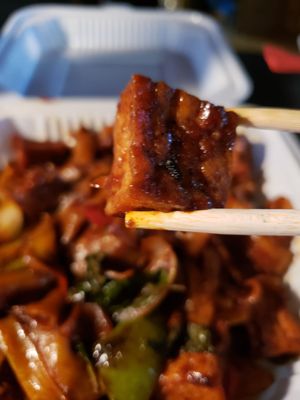 Bells peppers thai baby eggplants seasonal and basil leaves in a sauce mixture of hot and spicy green curry and coconut milk. The dishes are cooked in pure vegetable oil to bring out the. Moo Dang in Reno NV.